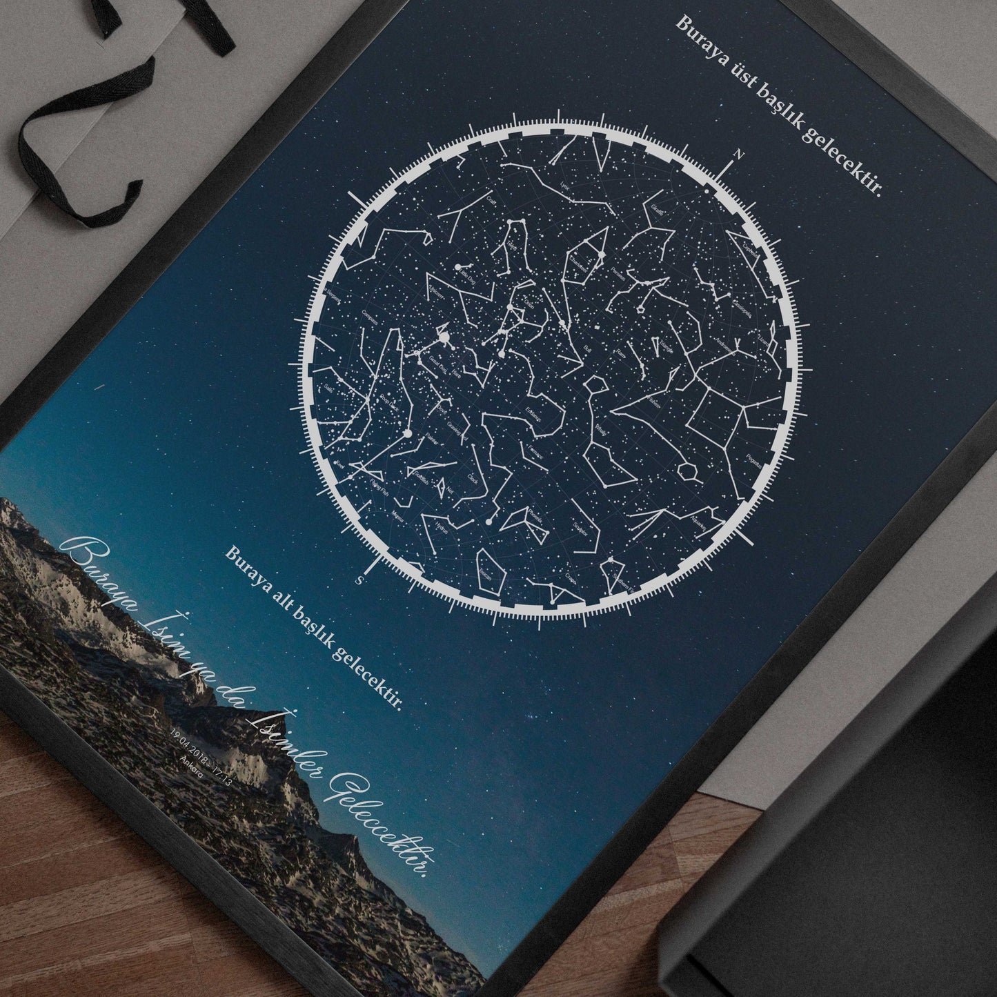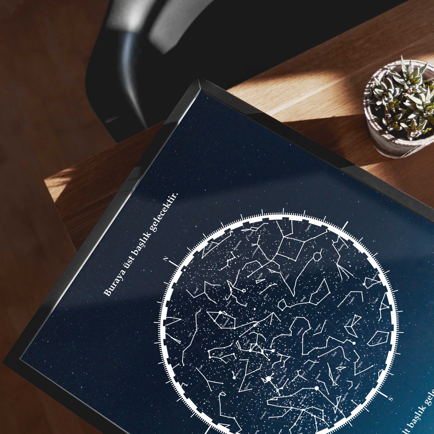 Gökyüzü Haritanız, belirttiğiniz konum ve tarih bilgilerine göre özel olarak tasarlanır. Haritalar, Avrupa Uzay Ajansı (ESA) arşivinden alınır ve seçtiğiniz tasarıma göre düzenlenir. Dijital ortamda özenle hazırlanan bu haritalar.