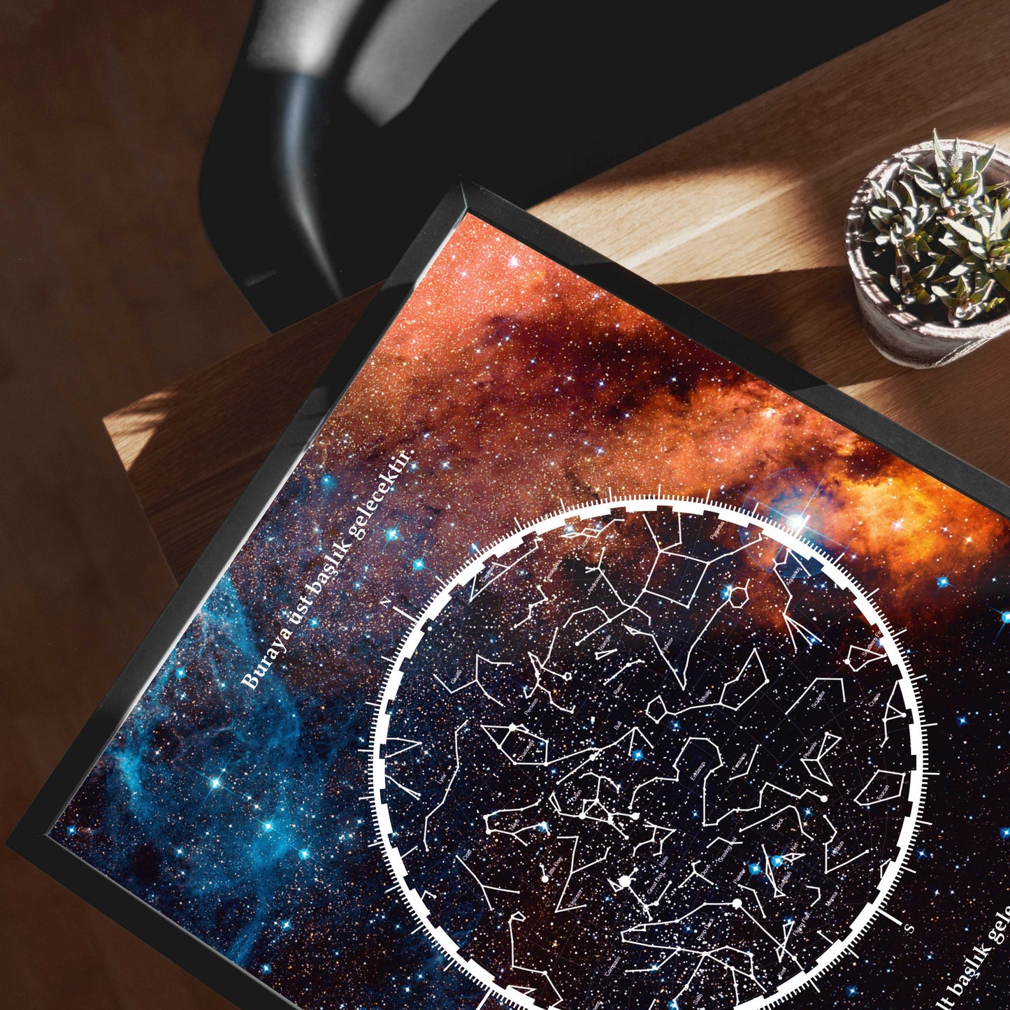 Gökyüzü Haritanız, belirttiğiniz konum ve tarih bilgilerine göre özel olarak tasarlanır. Haritalar, Avrupa Uzay Ajansı (ESA) arşivinden alınır ve seçtiğiniz tasarıma göre düzenlenir. Dijital ortamda özenle hazırlanan bu haritalar.