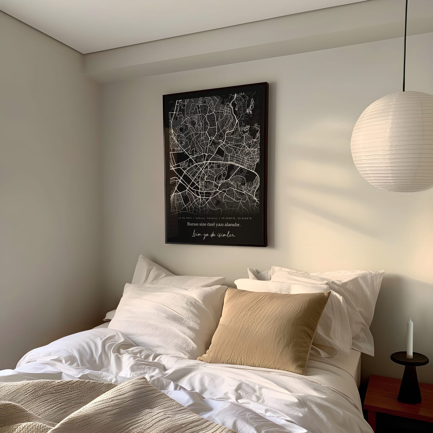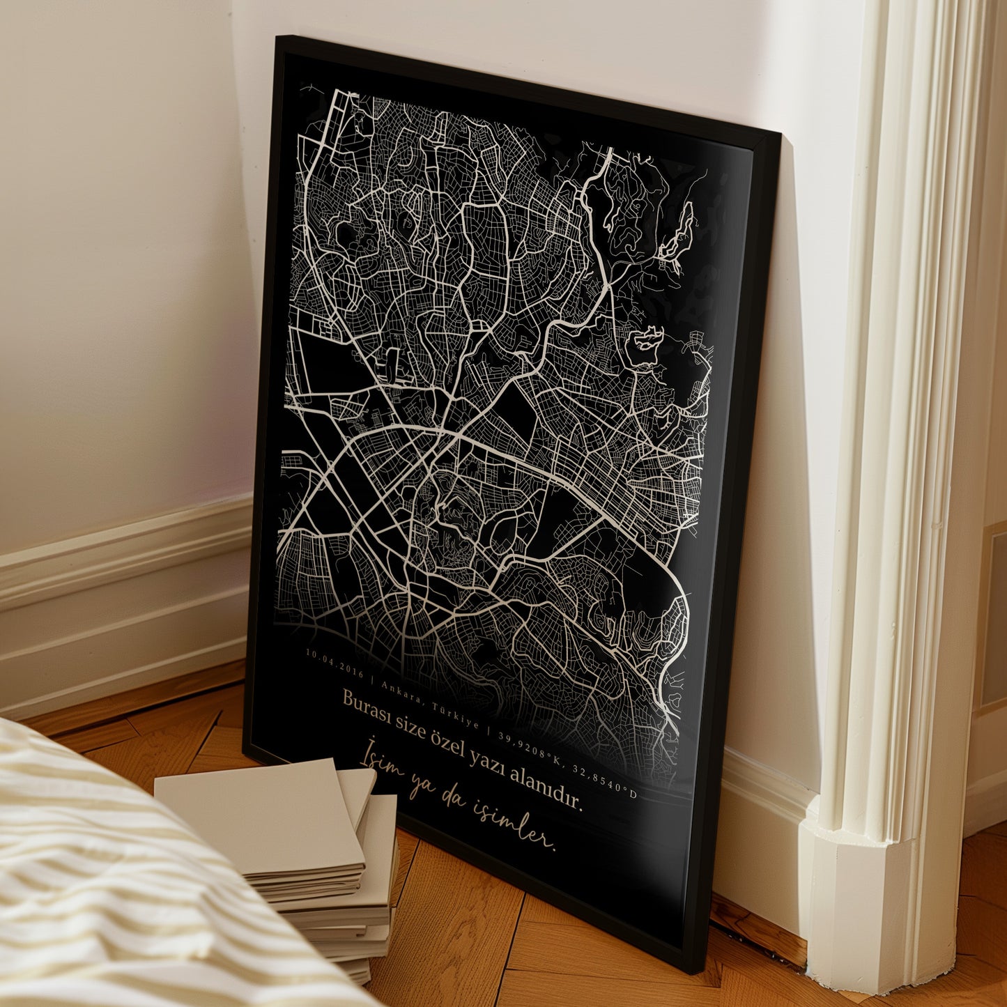 Sizlerin verdiği konum bilgileri doğrultusunda, seçtiğiniz şehrin haritasını özel bir tasarımla buluşturuyoruz. Tasarım süreci tamamen kişiye özel olarak yürütülür ve her detay titizlikle ele alınır. Haritanız, Fine Art baskı kalitesiyle, yüksek kaliteli 300 gr. fotoğraf kağıdına basılır. Böylece hem görsel olarak çarpıcı hem de uzun ömürlü bir tabloya sahip olursunuz. Harita, baskı işlemi tamamlandıktan sonra özenle çerçevelenir ve teslimata hazırlanır.